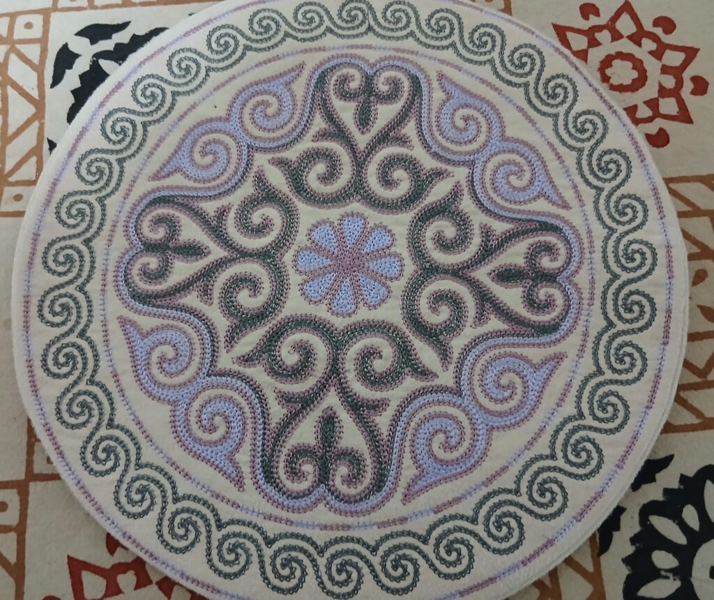 モンゴルのカザフ族なる女性作唐草模様は絹の道から