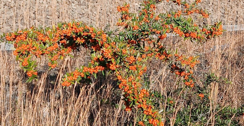 誰植えた、線路の脇のピラカンサひもじい鳥のなせる業らし