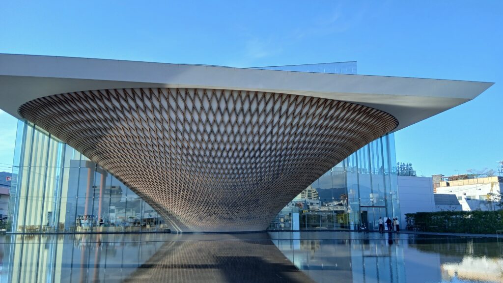 逆さ富士水盤に写す正像や巧みな木組みはShigeru Banなり